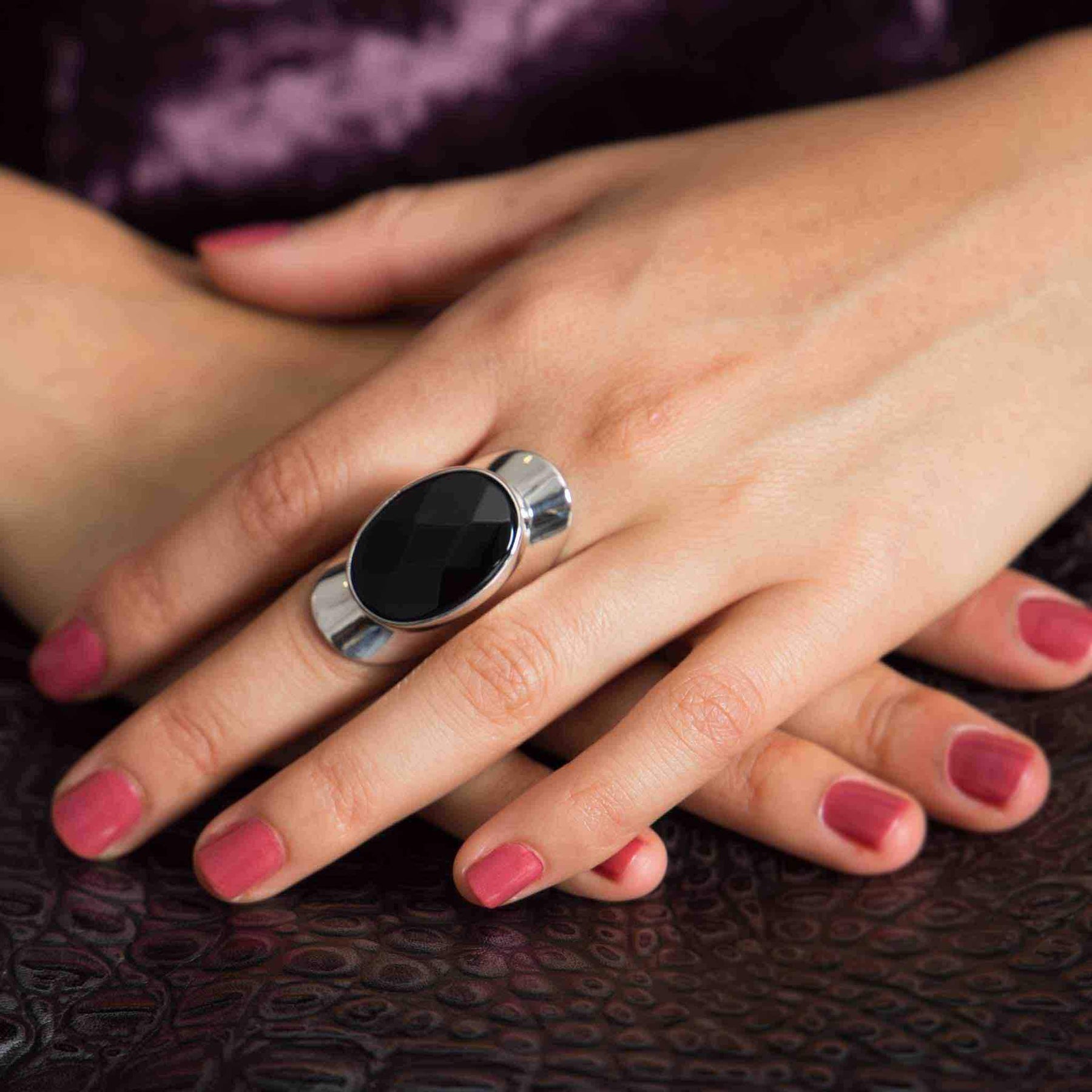 Anillo de Plata ley .925, una majestuosa pieza, simbólica por la obscura piedra onix y su corte facetado que crea los brillos de la misma. Pieza ajustable, con discreto corte lateral.