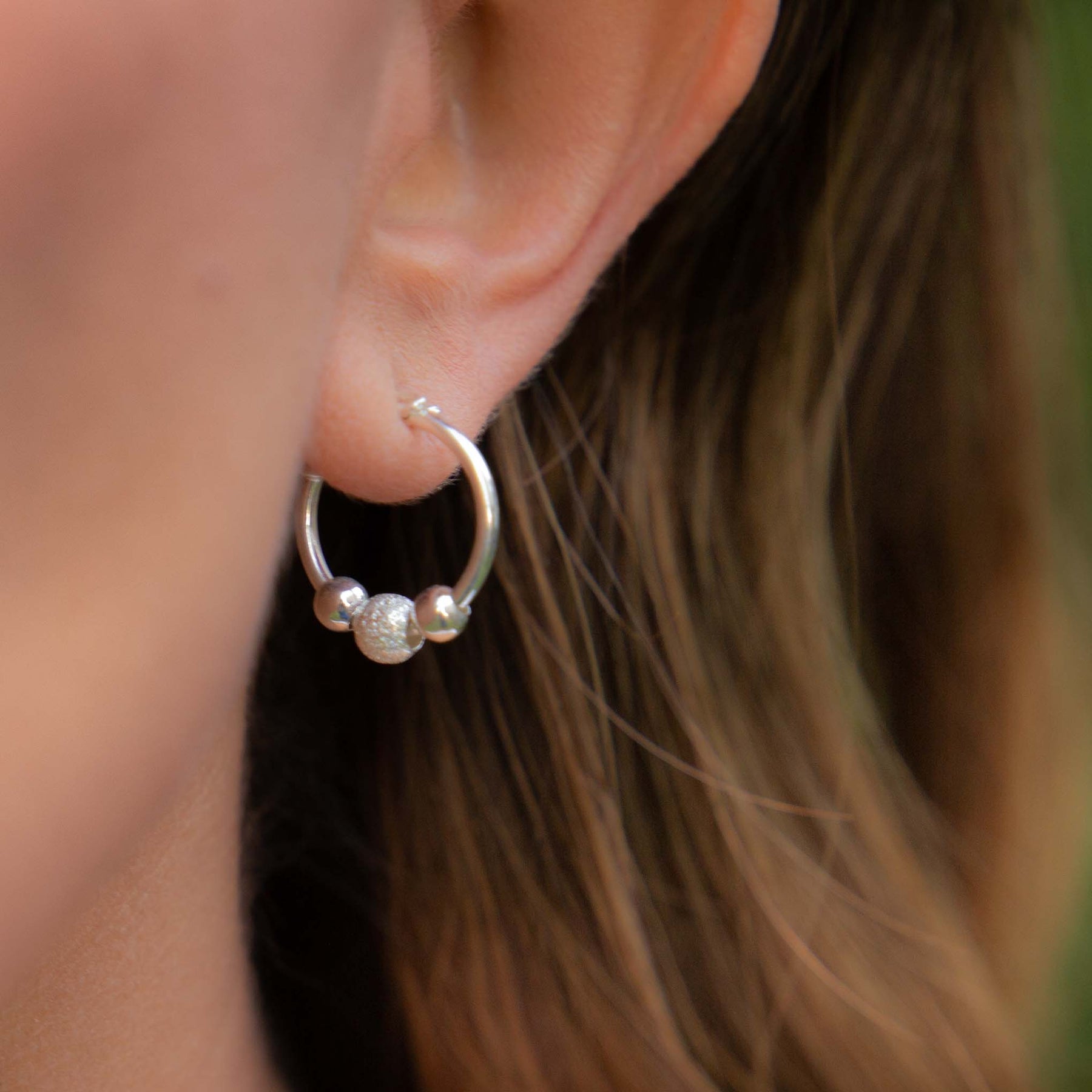 Fina y elegante arracada ideal de aro acompañada de tres esferas siendo la que más destaca por su acabado diamantado que no podrá pasar desapercibida por nadie. elaborada de plata .925 lo hace el accesorio ideal para resaltar tu seguridad y belleza. Además cuenta con broche de presión para evitar se caiga en momentos inesperados.