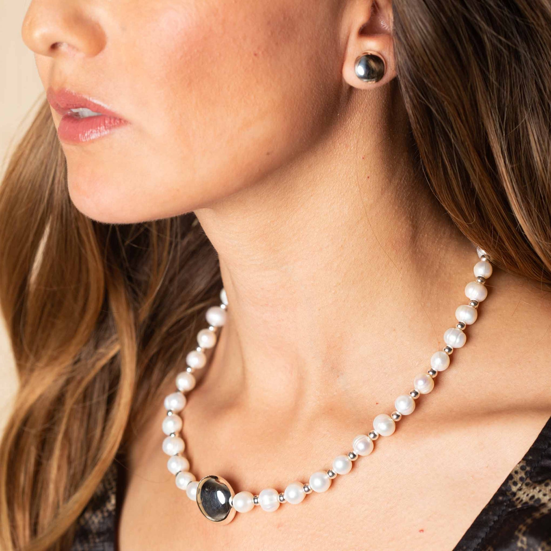 Elegante collar y aretes de plata .925 con perlas cultivadas de río, combinan la elegancia con la belleza clásica, los aretes complementan perfectamente el collar, creando un conjunto armonioso para una ocasión especial.
