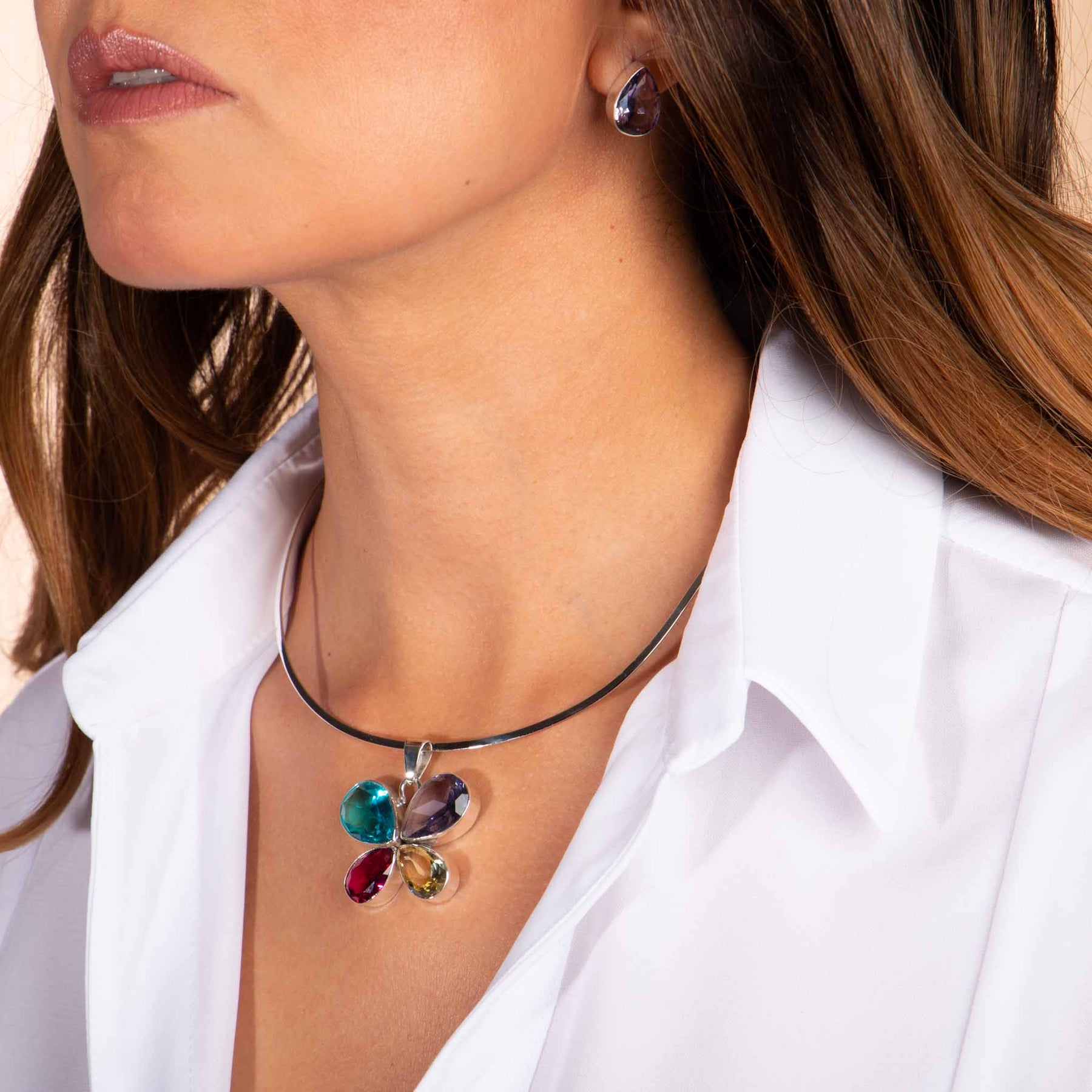 Juego de Plata ley .925 con una Mariposa de Cristal. Recibe a un día soleado con los brazos abiertos, lleva contigo un cristal de color y deja que el sol haga el resto. Las alas están montadas en un bisel de plata. El juego NO incluye la gargantilla Aretes; 1.8 cm de alto, 5 mm de largo, 9 mm de anchoDije; 5 cm de alto, 1 cm de largo, 2 cm de anchoPeso: 19.16gAretes;Dije; 10.64 g