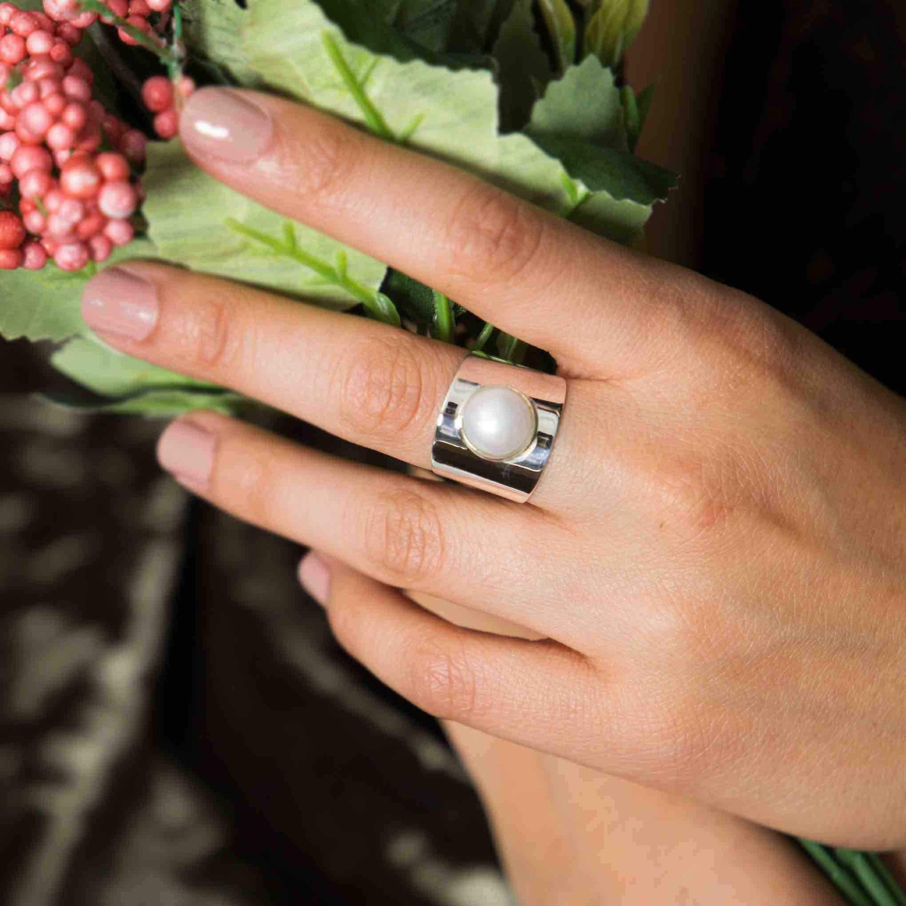 Un gran anillo hecho de plata .925 dónde al centro del mismo se alza una perla cultivada en río, la cual esta biselada para resaltar y sujetar esta pieza, este anillo es ajustable por la parte inferior. , Perla cultivada en río.
