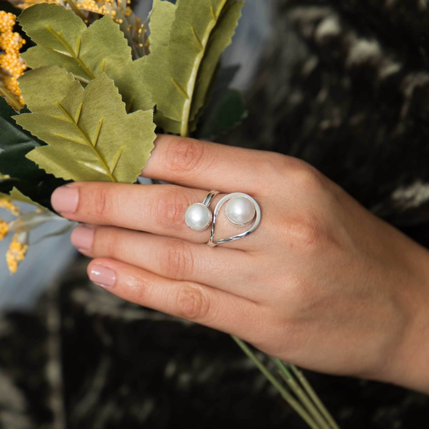 Un excelente anillo hecho de plata .925 en conjunto con perlas cultivadas de río que se incorporan al diseño mediante una base biselada que se entrelaza simulando un ocho con una forma parecida a una gota, la ventaja de este anillo es que puede ajustar por la parte superior. , Perlas cultivadas en río
