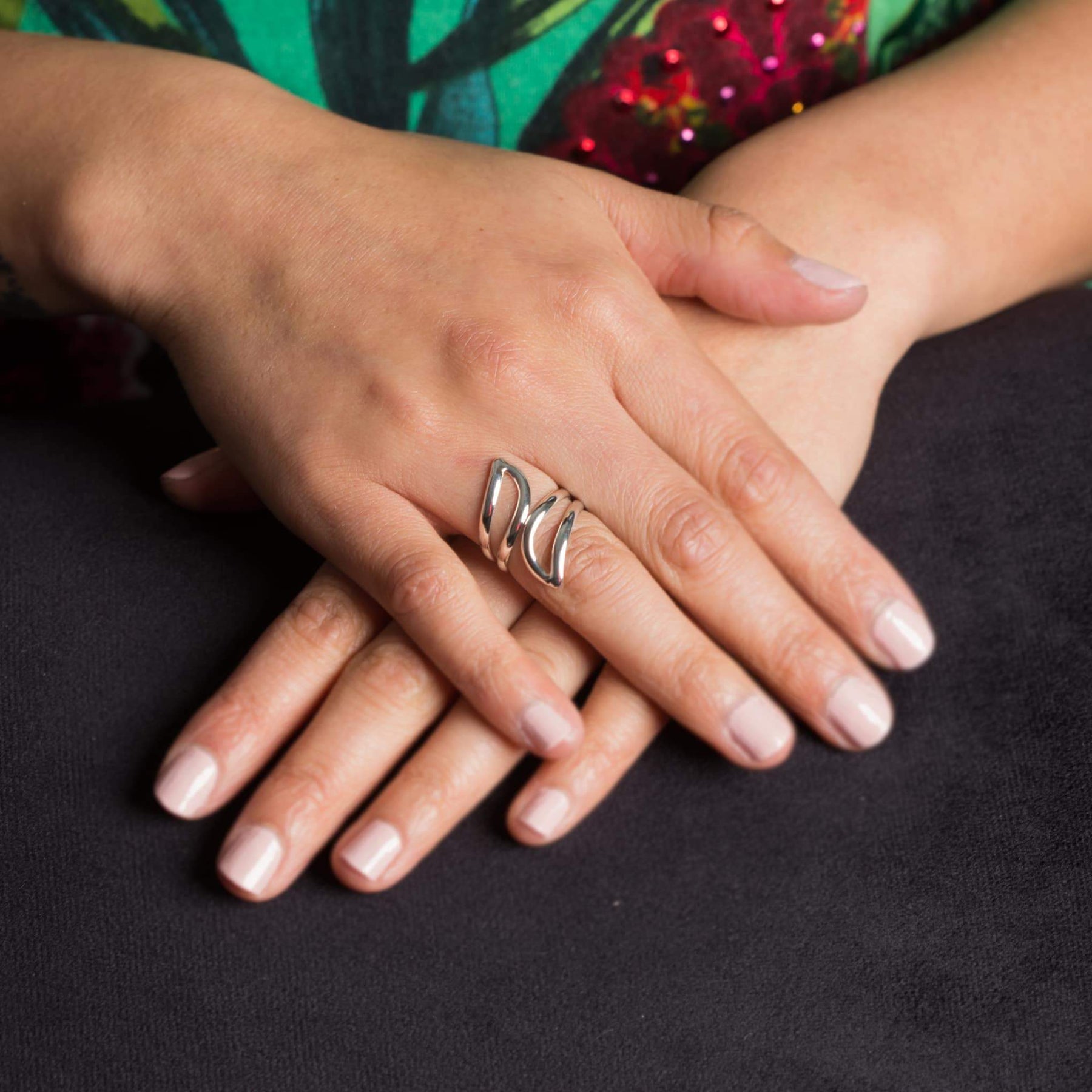 Anillo hecho de Plata ley .925, confeccionado por dos líneas de plata que al juntarse forman dos picos abrazando tu dedo. Es anillo ajustable, por lo tanto, se acopla perfecto al tamaño que tu desees.